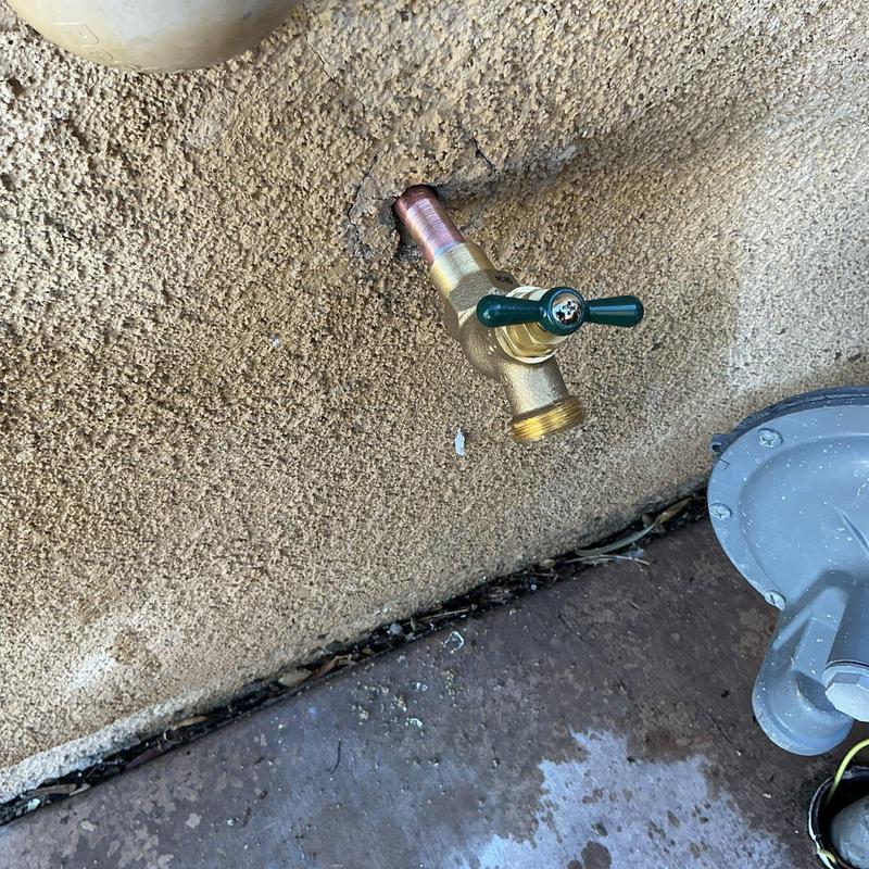 A plumber in Temecula, California replaced a leaking backyard hose bib that would not shut off. After receiving approval, the plumber installed a new three-quarter MIP hose bib and confirmed there were no leaks after installation.