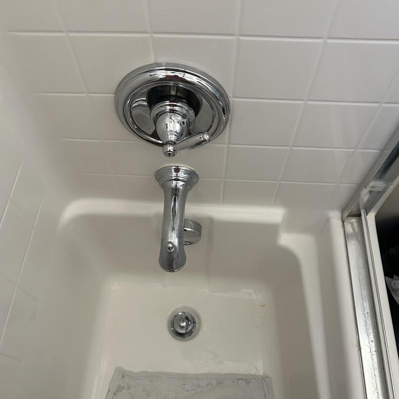 A plumber in Temecula, California removed an old shower valve and trim, then installed a new Moen Posi-Temp single-handle valve with chrome trim, tub spout, and shower head. The plumber accessed drywall behind the shower and tested the system after restoring water to ensure there were no leaks.