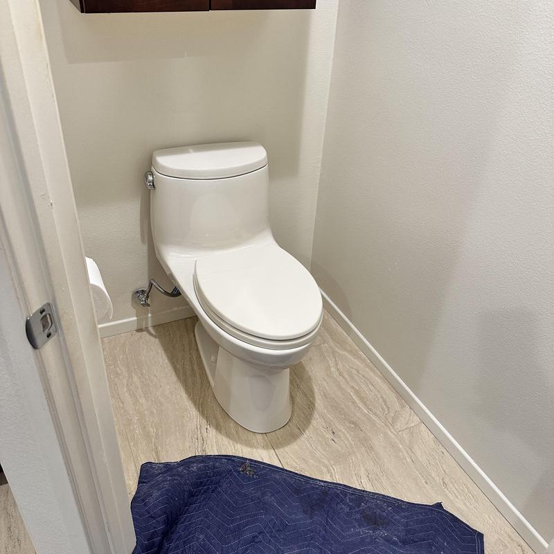 R and R Plumbing installed a Kohler one-piece toilet in the master bathroom in Hemet, California. The work included placing a new wax seal, fitting closet bolts, adding a 1/4-turn shut-off valve, connecting a new water supply line, and removing the previous toilet.