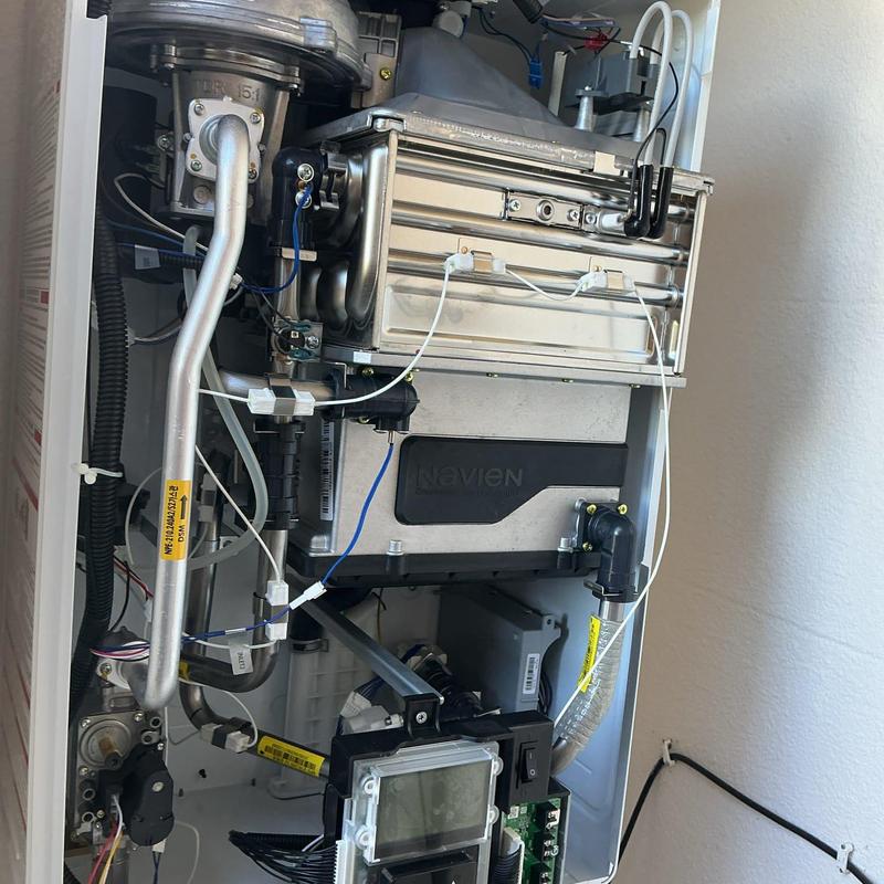 A plumber in Temecula, California removed an old tankless water heater, modified the piping, and installed a new Navien 240A unit. The plumber added a crossover tee under the kitchen sink and restored water flow, checking all connections for leaks to ensure proper operation.