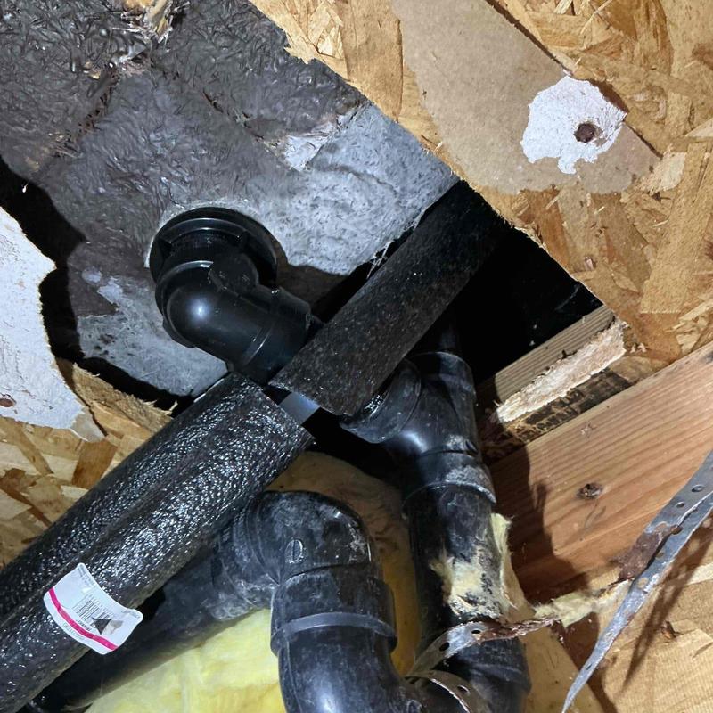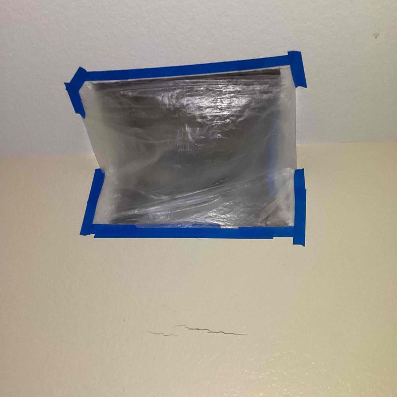 R and R Plumbing inspected a water heater exhaust vent in a Murrieta, California home. Technicians cut drywall in an upstairs room to locate a leak. They removed faulty aluminum tape and applied new tape to seal vent joints correctly. The area was sealed with plastic sheeting, and a drywall contractor referral was provided.