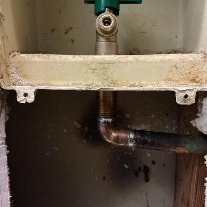 A plumber in Murrieta, California replaced a seized ice maker valve. The plumber shut off water, removed drywall for access, replaced the old valve and copper fittings, then restored water and tested the system. The plumber confirmed there were no leaks after completing the repair.