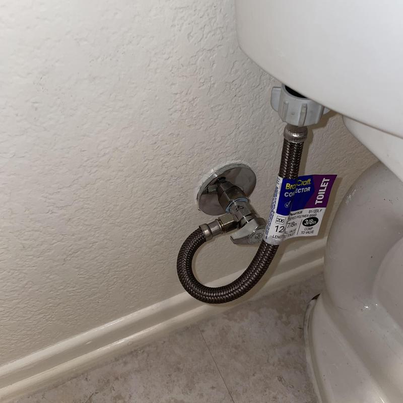 A plumber in Temecula, California replaced a failed wax ring and reinstalled a toilet in a downstairs hallway restroom. After detecting leakage during testing, the plumber reinstalled the toilet again and replaced the angle stop valve to stop the leak and ensure proper function.