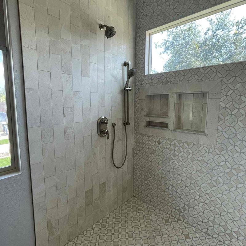 A plumber in Murrieta, California installed new shower valve trim, including a valve cover plate, handles, shower head, and an adjustable hand shower bar. The plumber sealed all fixtures to the wall and tested both shower functions to ensure no leaks were present after installation.