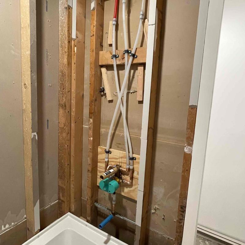 R and R Plumbing removed tile, leveled mortar, and jackhammered concrete to access a drain line in Hemet, California. They rebuilt the ABS drain with a P-trap, set a new shower base, installed a Moen Posi-Temp valve, and secured wall panels with caulking and adhesive. All demo debris was removed. Drywall work was excluded.
