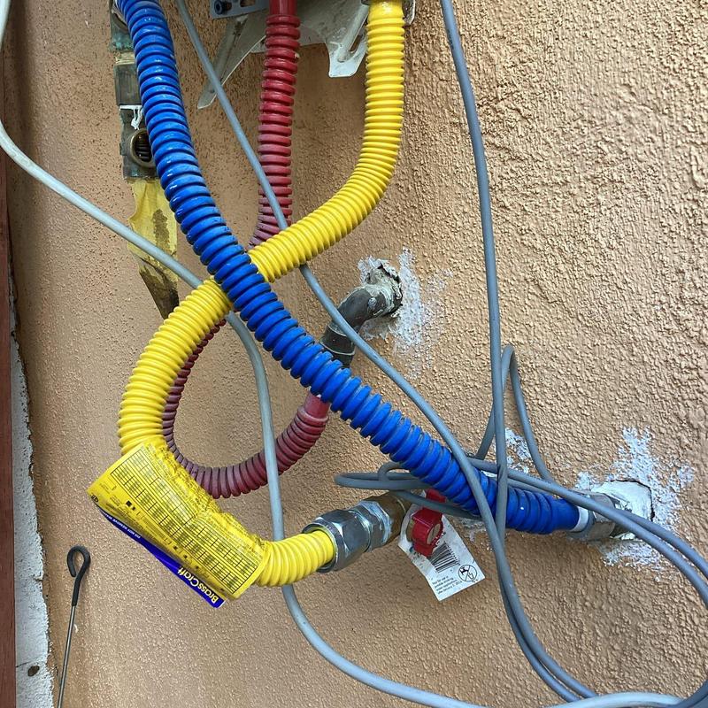 R and R Plumbing installed a new gas line for a BBQ island griddle in Hemet, California. They connected the line using valves, tees, and nipples, tested for leaks, and ensured proper operation. They also found and fixed two leaks on a tankless water heater gas line by replacing a faulty flex line.