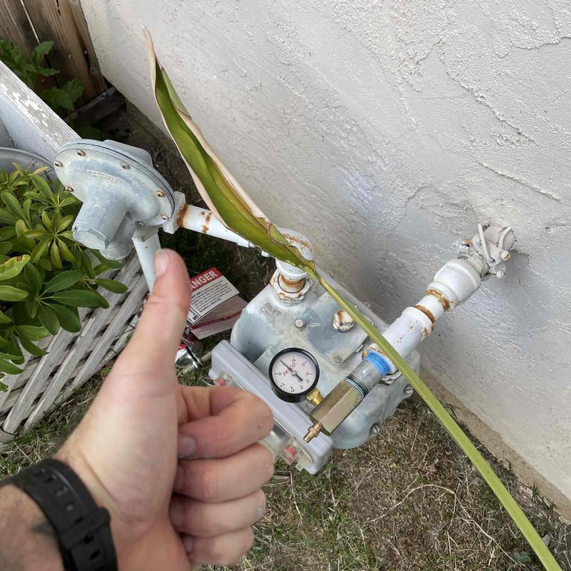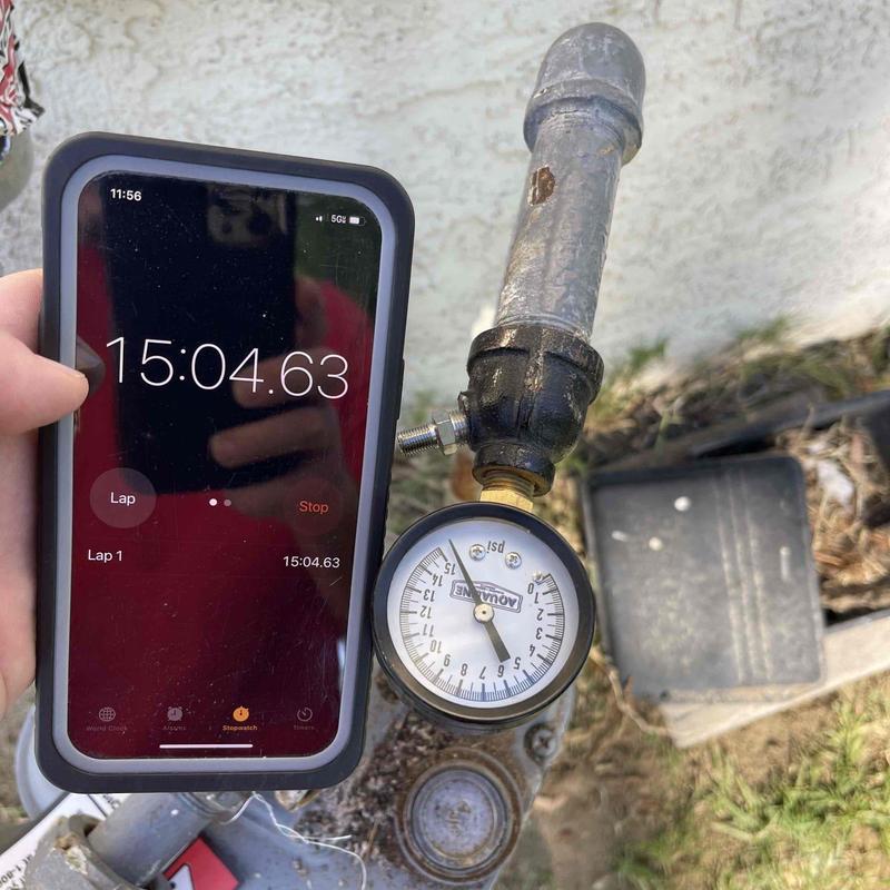 A plumber in Temecula, California inspected a home's gas system after a reported leak. The gas meter was removed, and both indoor and outdoor lines were pressure-tested. The system held 15 psi for 15 minutes, confirming no leaks. The plumber then safely reconnected the gas meter.