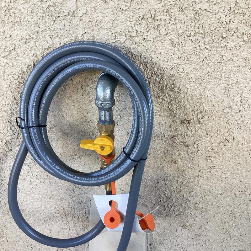 A plumber in Temecula, California connected a natural gas quick-connect fitting to an existing gas manifold. The plumber also relocated a barbecue, attached it to the gas line, and tested all fittings to confirm safe operation. The system was inspected and the barbecue was successfully lit for use.