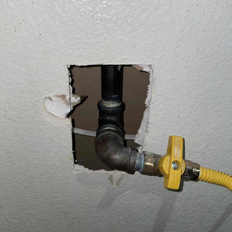 A plumber cut drywall to expose a gas pipe and installed a shut-off valve outside the wall. This service allows easier access for future maintenance or emergency shut-off. Work took place in Lake Elsinore, California.
