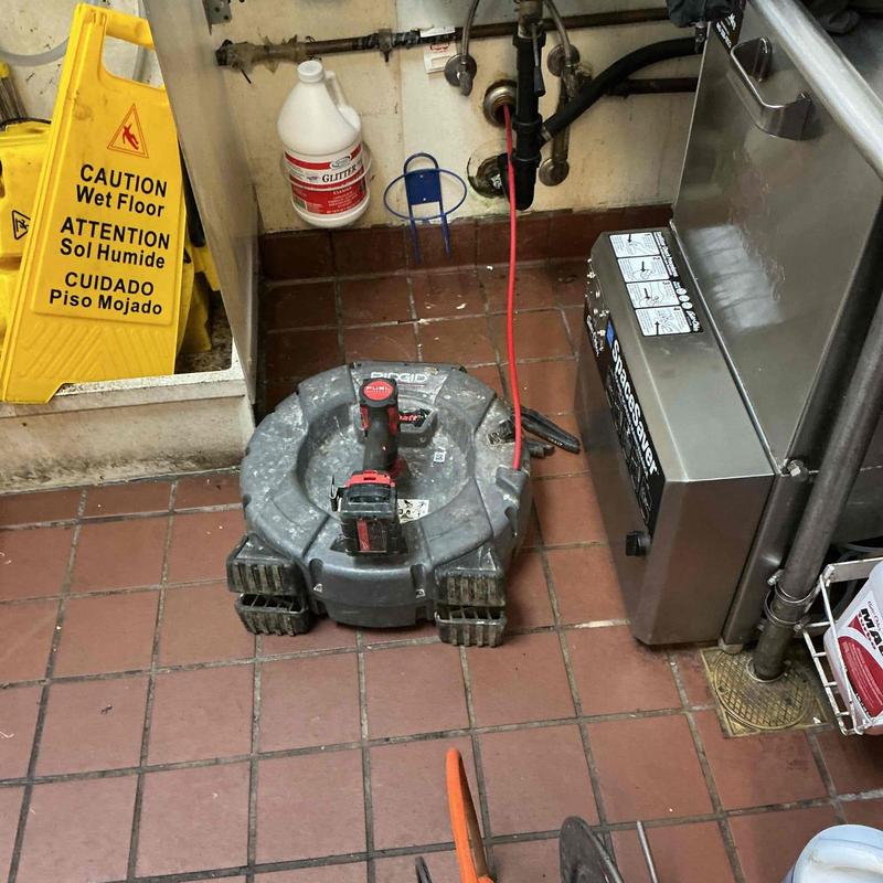 A plumber in Temecula, California performed a hydro jet service on a main sewer line connected to grease interceptor cleanouts. The service included removing grease buildup, a video inspection, and locating damaged cast iron piping near drains and a mop sink. The plumber recommended replacing eroded cast iron sections with ABS pipe.
