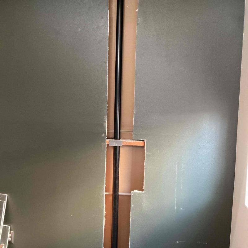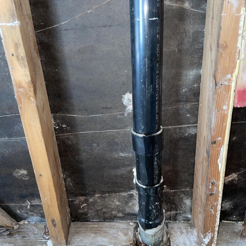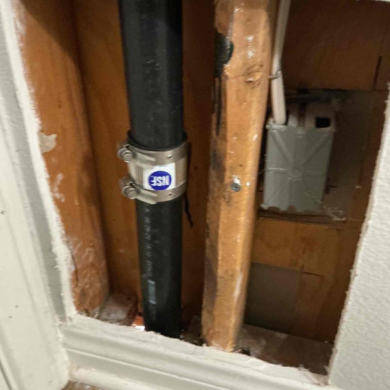 A plumber in Murrieta, California replaced a failed cast iron drain stack leaking behind drywall between a living room and dining room. They installed new ABS piping with stainless steel bands and a steel strike plate. The system was tested using shower and bathtub drainage, confirming no further leaks were present.