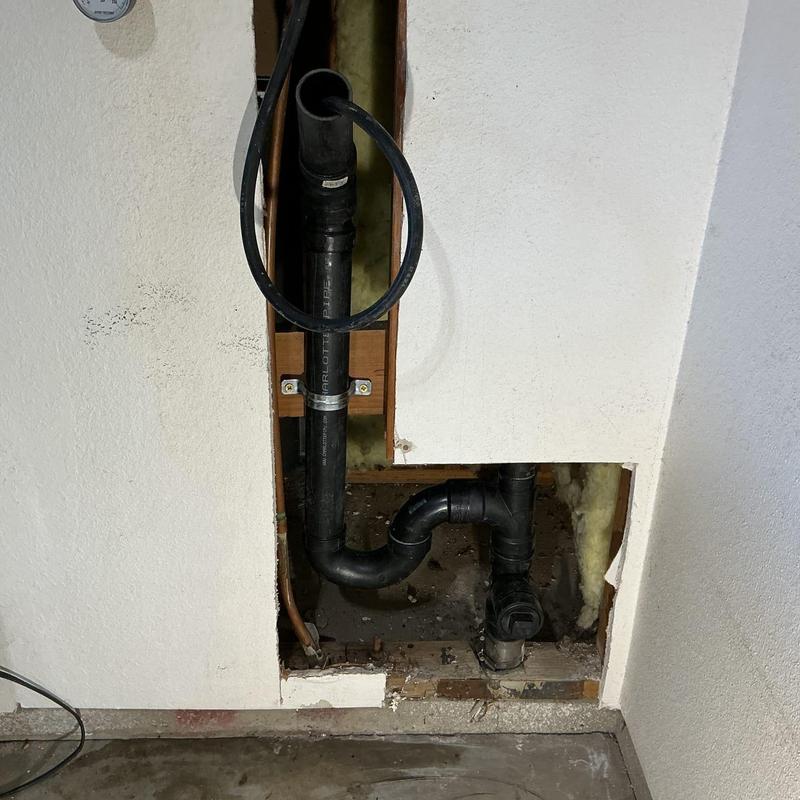 A plumber in Murrieta, California replaced damaged cast iron fittings with ABS piping for a washer drain in a garage. The technician removed drywall, rebuilt the drain at the foundation, installed a new cleanout with cap, and tested the system to confirm proper drainage and no leaks.