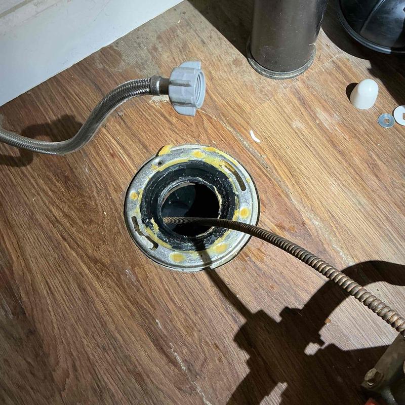 A plumber in Murrieta, California, removed a leaking toilet and installed a new wax seal to stop water from dripping through the ceiling below. After installation, the plumber performed multiple flush tests to verify a proper seal. The service includes a one-year workmanship warranty.