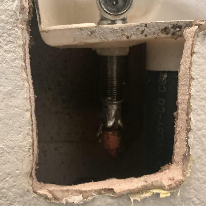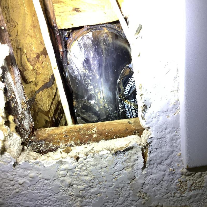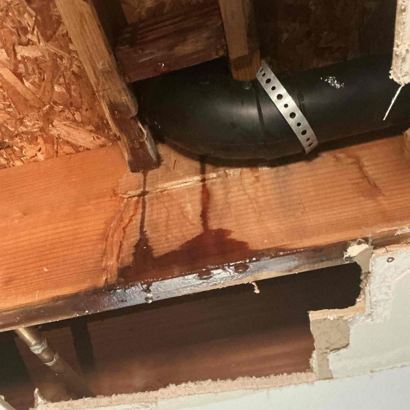 A plumber in Temecula, California investigated ceiling staining in an office. They removed drywall to locate the source and identified rotted plywood likely caused by water escaping beneath a second-floor shower door. No leaks were found in the waterlines or drainage system after testing. Drywall repair was not included in the service.